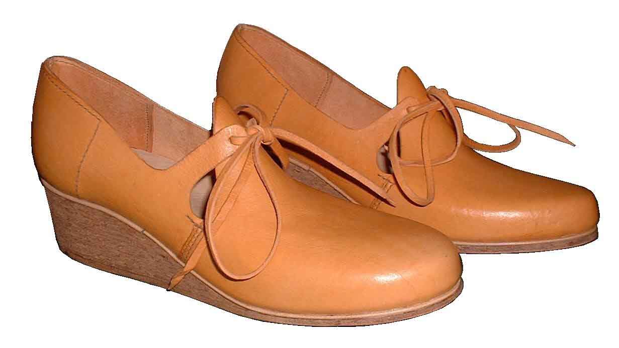 Round Nose latchet shoe with cork wedge heel (a specific design for a customer). |